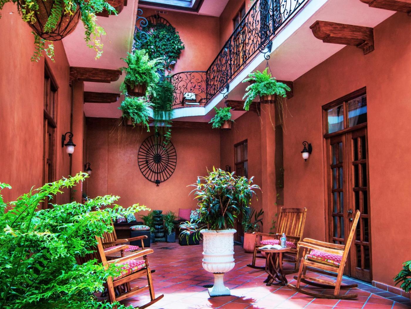 Double Queen Suite. This is a spacious (1200 sq ft) two bedroom suite on the top floor with queen size beds with memory foam mattresses and Egyptian cotton sheets. There are two bathrooms with organic, paraben free toiletries, a full kitchen and large living room. The suite has a large front balcony overlooking the street and another overlooking the interior courtyard.